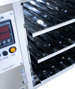 Professional full automatic Incubator for queen rearing. The incubator is equipped with an LED light and a double-glazed thermally insulated door. The walls of the cabinet are insulated with polyester and covered with stainless steel.