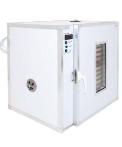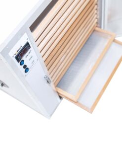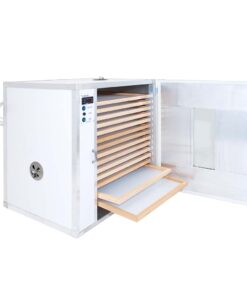 The dryer is equipped with an LED lamp and a double glazed thermally insulated door, thus the drying process can be controlled without door opening, without heat loss. The walls are insulated with polyester, and covered with Glasboard from the outside. The Glasboard is waterproof and hard, as well as easy to clean. It is not attacked by mould or rust and therefore does not corrode.