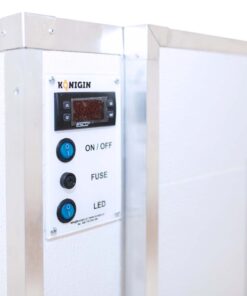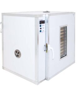 The dryer is equipped with an LED lamp and a double glazed thermally insulated door, thus the drying process can be controlled without door opening, without heat loss. The walls are insulated with polyester, and covered with Glasboard from the outside. The Glasboard is waterproof and hard, as well as easy to clean. It is not attacked by mould or rust and therefore does not corrode.
