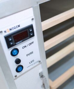 The dryer is equipped with an LED lamp and a double glazed thermally insulated door, thus the drying process can be controlled without door opening, without heat loss. The walls are insulated with polyester, and covered with Glasboard from the outside. The Glasboard is waterproof and hard, as well as easy to clean. It is not attacked by mould or rust and therefore does not corrode.